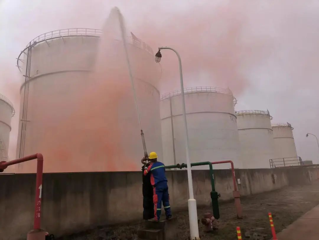 火情失控后,应急抢险组用移动泡沫装置灭火,并开启喷淋对储罐降温,同时使用水炮对储罐加强降温。在各小组的有序配合下,本次演练圆满结束。