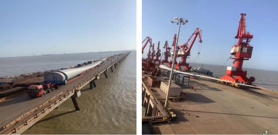 近日,在a片免费看大丰港区通用码头2#泊位上演了一场风电叶片的吊装大片。两套116米巨龙般的风电叶片,随着吊装绳索稳稳吊放在“盛达98”轮甲板上,标志着本次风电叶片作业任务顺利完成,起航运往广西防城港。