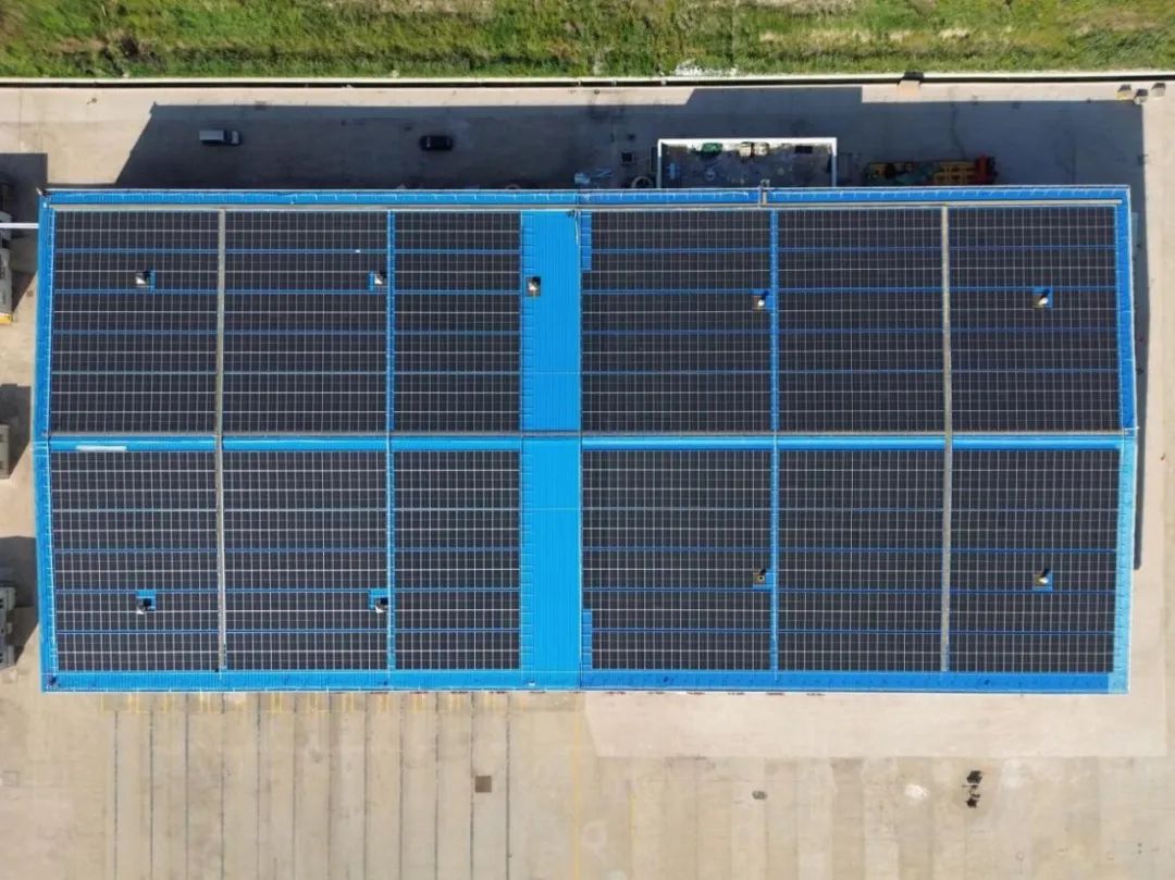 从高空俯瞰,整个屋顶被密密麻麻的光伏太阳能板覆盖,它们在烈日下熠熠生辉,每一块小小的光伏板都承载着巨大的绿色能量。