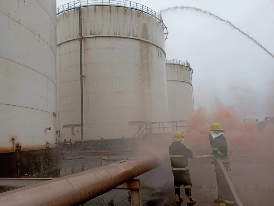 在模拟罐组一泵房法兰垫破裂发生汽油泄漏引起火灾的消防演练中,各小组配合默契、反应迅速、衔接有序、措施果断,现场忙而不乱,参演人员对指挥人员下达的每一个指令都能够在第一时间给予回应并立即执行,确保紧急情况下第一时间抢险救援。各小组结合现场情况分析应对初起火灾的应急处置流程、周边消防设备设施的正确使用要领、火灾扑救消防安全知识等,同时确保每名职工都能牢牢掌握会报警、会扑救、会疏散的必备消防技能。真正做到掌握消防应急技能,练就过硬本领。