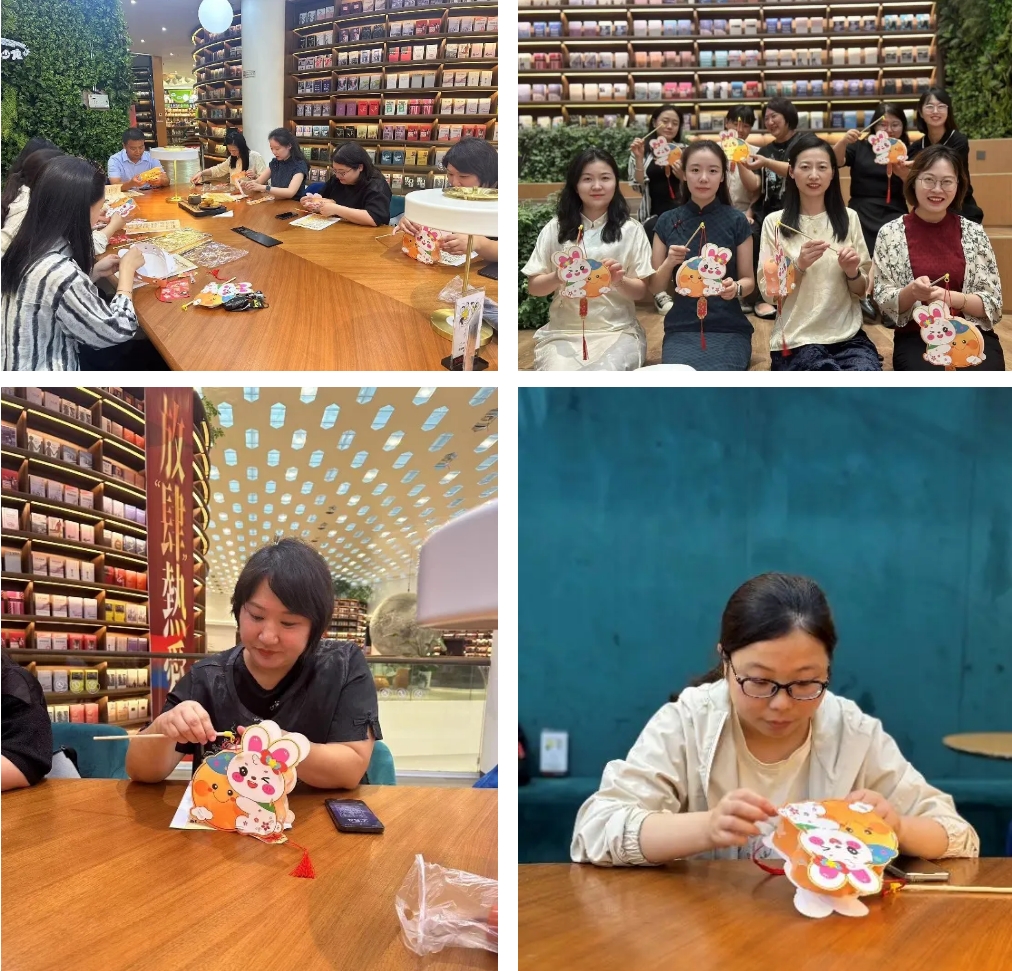 系上流苏绳,穿上灯带,扣入玉兔,大家认真制作着属于自己的花灯,一个个俏皮可爱的古风灯笼就制作成型了。制作玉兔花灯环节让组员们亲自动手体验了文化遗产的魅力,不仅展示了组员们的创造力,也体现了对传统文化的传承与尊重。灯笼制作完成后,所有参与人员在花灯的映照下合影留念,留下了这个温馨时刻的美好记忆。