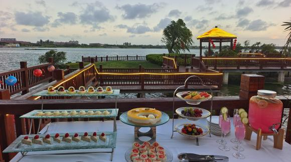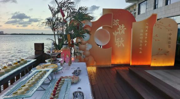 金秋户外赏月活动现场,酒店精心布置了日月湖畔中庭区域,如嫦娥奔月的壁画、玉兔造型的摆件等,绸缎台面上摆满了各种精致的月饼、新鲜的水果和香醇的茶点,周围点缀着璀璨的灯光,处处洋溢着浓厚的节日氛围。现场的小游戏环节,顾客们踊跃参加,更是将整个活动氛围推向了高潮。
