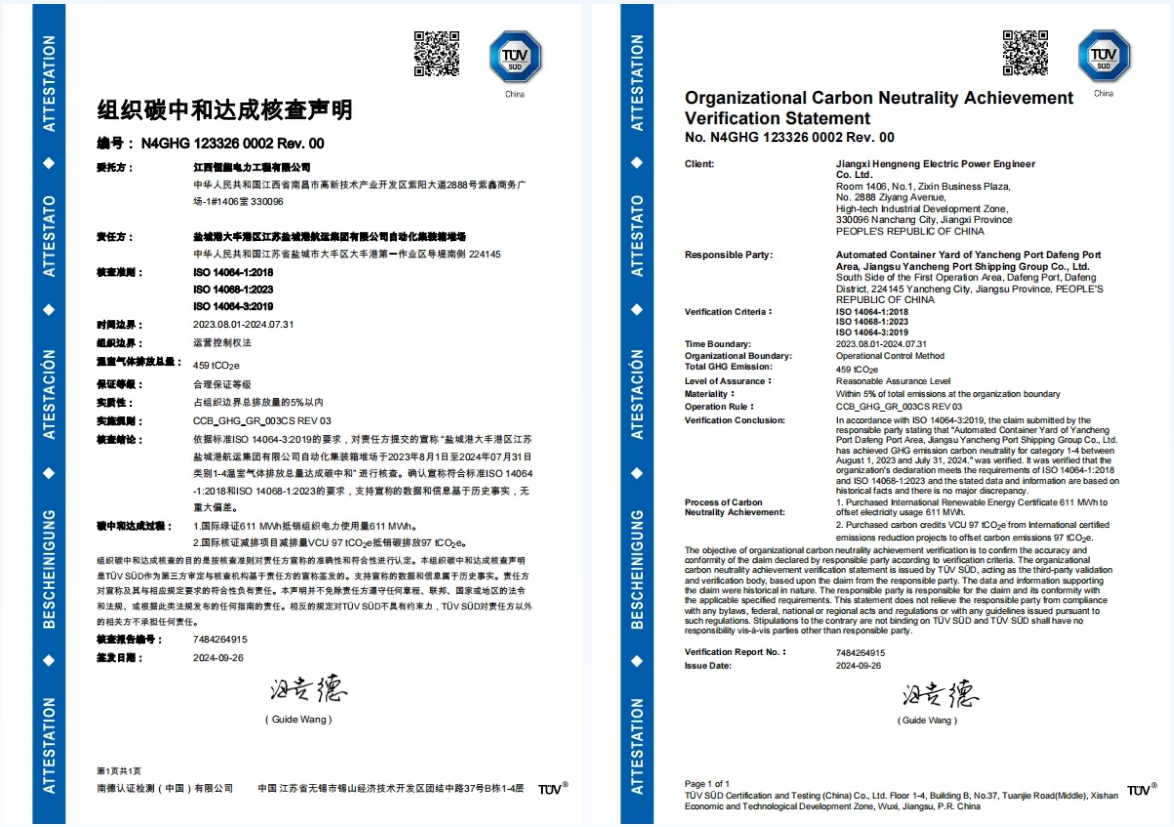 9月26日,a片免费看大丰港区江苏a片免费看航运集团有限公司自动化集装箱堆场获得TUV南德意志集团颁发的《组织碳中和达成核查声明》,成为国内首个获得“碳中和”认证的堆场项目(TUV南德意志集团成立于1866年,总部位于德国慕尼黑,是世界上规模最大、最古老的TUV检验机构)。这是继2023年a片免费看自动化集装箱堆场获得碳中和承诺审定以来,a片免费看在落实国家“双碳”目标,积极推动港口绿色低碳发展,奋力为盐城勇当全省发展新质生产力重要阵地“碳路先锋”做出的又一项重要实践。