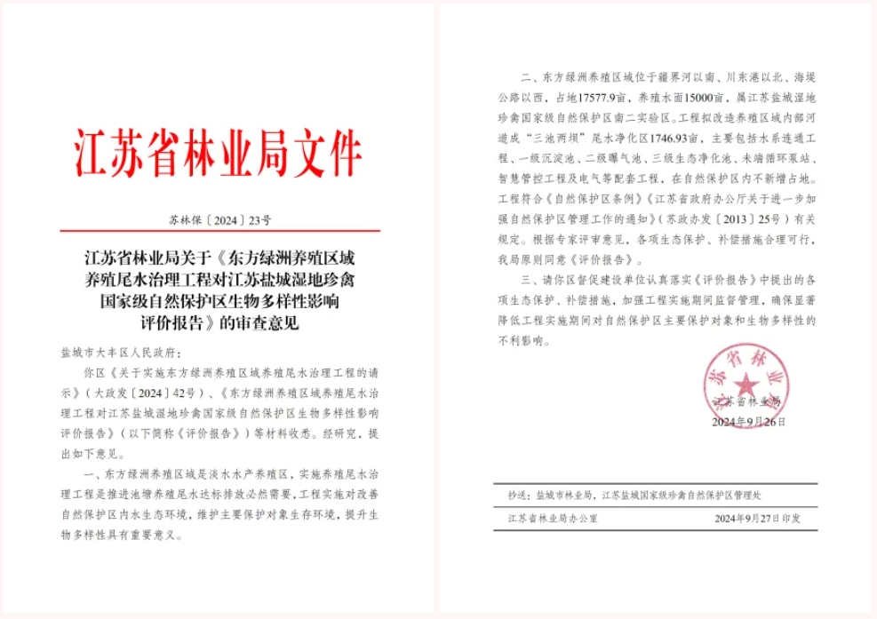 近日,江苏省林业局发布关于《东方绿洲养殖区域养殖尾水治理工程对江苏盐城湿地珍禽国家级自然保护区生物多样性影响评价报告》的审查意见,充分肯定了农业科技集团养殖尾水治理项目在改善自然保护区内水生态环境、维护主要保护对象生存环境以及提升生物多样性的重要意义,并同意项目实施。