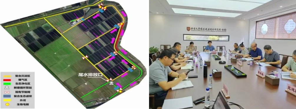 为明确区域尾水治理方案,农业科技集团通过公开招标,委托南京大学环境规划设计研究院集团股份公司编制《东方绿洲养殖区域养殖尾水治理工程实施方案》《生物多样性评价报告》以及《有限人为活动论证报告》。为了更快、更好编制方案,农业科技集团明确专人和编制单位深入养殖区,详细了解区域沟塘分布、养殖品种、数量、密度、尾水排放集中期、水量及周边企业污水排放等情况,对项目区内6处点位水质进行取样检测。通过现场情况分析,计划建设尾水净化区约1746.93亩(占养殖净面积约11.65%,占整个养殖区域9.95%),尾水总停留时间11.75天,日处理能力约20万方,确保养殖尾水排放达到《池塘养殖尾水排放标准》(DB32/4043-2021)淡水受纳水域一级标准。