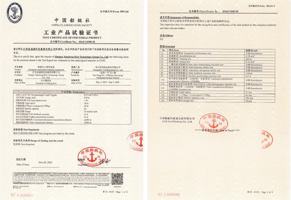 “盐港一号”近海测绘无人装备建造完成后,科技集团邀请中国船级社、测绘公司等单位在大丰港区共同开展了实船验证,对负载、航速、定位和路径反馈精度、图传和通讯、路径规划等主要性能指标进行了验证,成功获得了船级社颁发的工业产品试验证书,为后续港口测绘装备优化改进提供了数据支持,为产品投入应用和产业化打下了坚实基础。