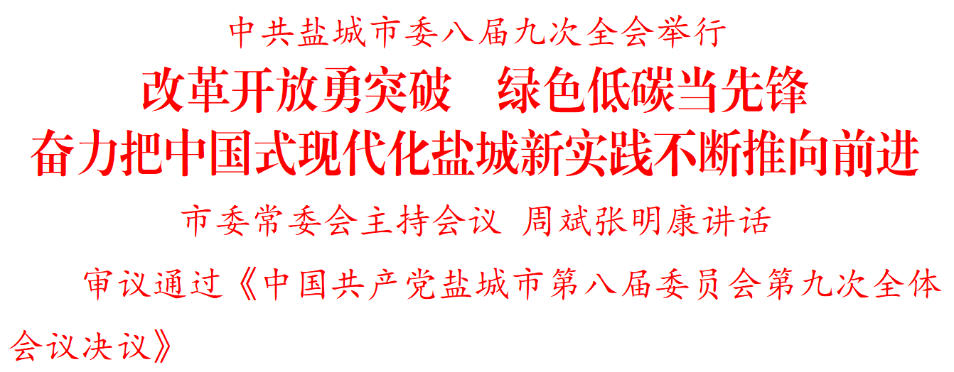 12月29日,中国共产党盐城市第八届委员会第九次全体会议举行。全会坚持以习近平新时代中国特色社会主义思想为指导,深入贯彻落实党的二十届三中全会、中央经济工作会议和省委十四届八次全会、省委经济工作会议精神,总结今年工作,部署明年任务,动员全市上下进一步全面深化改革开放,坚定不移推动绿色低碳发展,高质量完成“十四五”规划目标任务,奋力把中国式现代化盐城新实践不断推向前进。