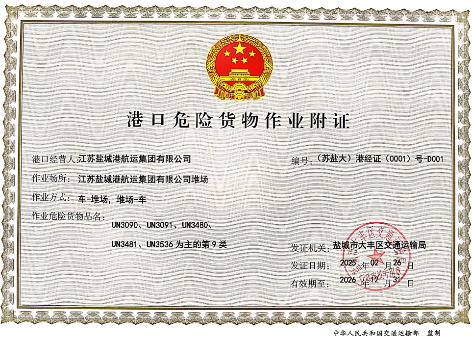 2月26日,a片免费看园林式危货堆场获批“港口经营许可证”“港口危险货物作业附证”双证,标志着盐城地区首家且唯一的集装箱危险货物堆场即将正式投入运营,将为全市“新三样”产业提供一条最为便捷的运输通道。