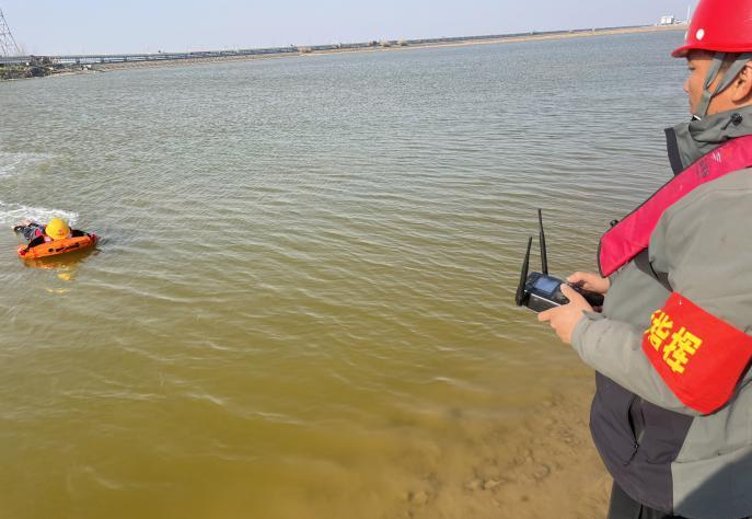 本次演练与港航勘测设计公司联合进行,模拟临水测绘作业人员意外落水的突发事件。在预设救援力量不足的条件下,应急指挥中心迅速启动三级响应机制,组织应急救援组、警戒保卫组、后勤保障组、医疗救护组协同处置。其中,项目应急物资库配备的遥控救生船首次投入实战应用,成为本次演练的最大亮点。