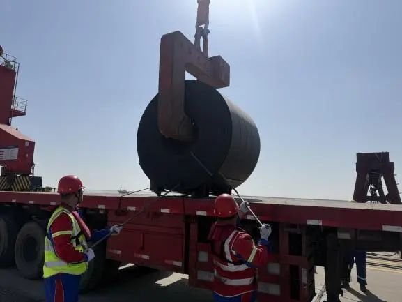 针对钢卷装卸特性,港区优化全流程跟踪服务模式。科学规划装卸方案,实现门机与运输车辆的高效协同;同步建立“货主-船方-作业团队”三方联动机制,通过专属联络群实时沟通对接需求,形成无缝衔接的作业链条。