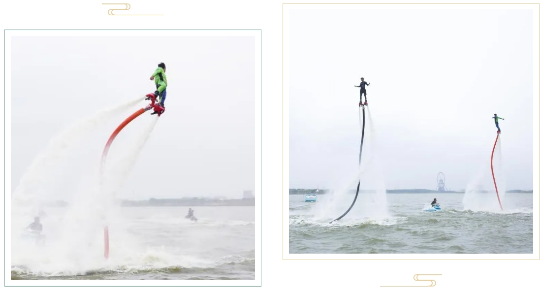 水上飞人表演区域欢呼声此起彼伏。两位表演者脚踩喷水装置,宛如灵动的飞鸟,在空中做出各种高难度动作,时而翻转,时而盘旋,与日月湖的美景融为一体,构成了一幅如梦如幻的画面。小朋友们瞪大了眼睛,满脸惊叹,纷纷拉着父母的手,表达着想要尝试的愿望。