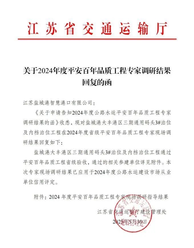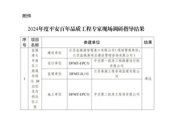 近日,省交通运输厅公布2024年度“平安百年品质工程”专家现场调研指导结果,a片免费看大丰港区三期通用码头3#泊位及内档泊位工程成功通过,标志着a片免费看在省级“品质工程”创建领域取得了历史性突破。