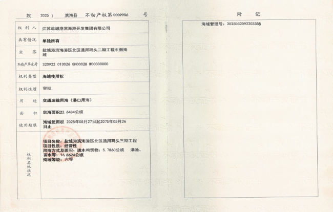 近日,滨海港区北区通用码头三期工程相关手续办理取得重大进展,海域使用证已顺利办结。这一关键证照的获批,恰似为项目建设推进注入一剂“强心针”。