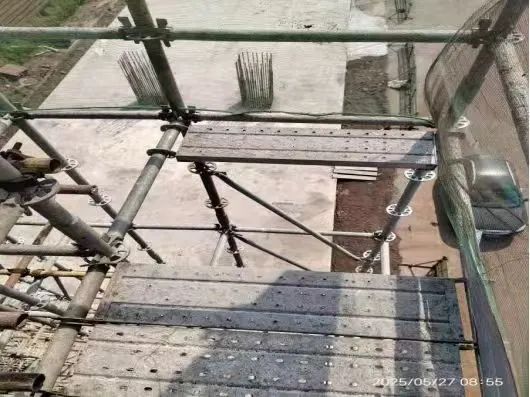 廊道外脚手架发现一处踏板缺失,且无安全提示牌,作业人员有坠落危险,安全风险较高,需即刻整改。