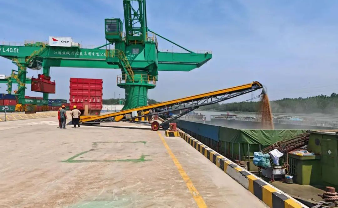 这是陆港集团亭湖港区与江苏丰溢良之泉农业发展有限公司携手创新,首次成功应用的“输送带直装”工艺,作业量达5000吨,全年预计20000吨。为区域夏粮运输开辟了一条高效、稳定的水上通道,有力保障了粮食供应链的畅通有序。
