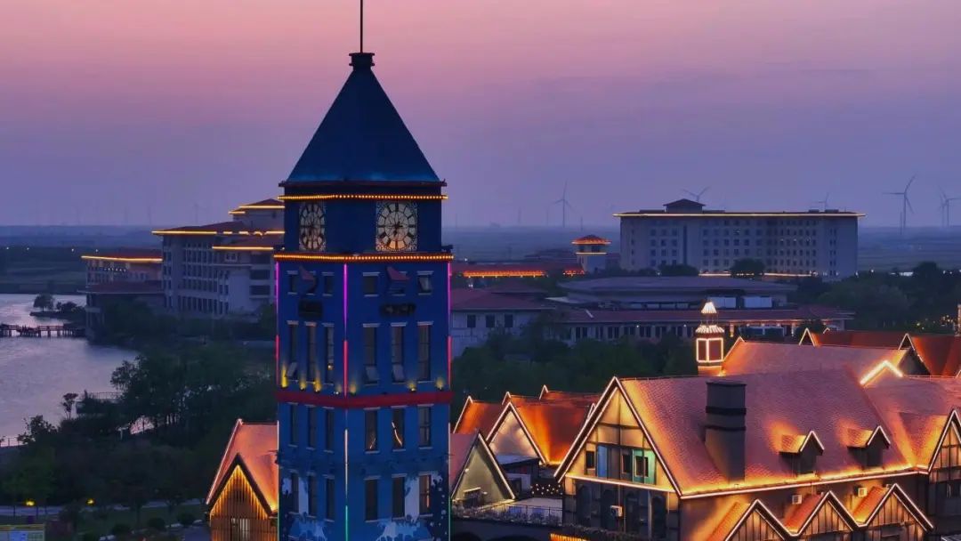 “蓝调时刻”的魅力,在于它的短暂与永恒共生。当最后一缕天光消失,港区并未沉入黑暗——龙门吊的警示灯如红色萤火,港泊文旅上演着精彩的灯光秀,把跨境电商商贸小镇变成了一幅赛博朋克风格的数字画卷。