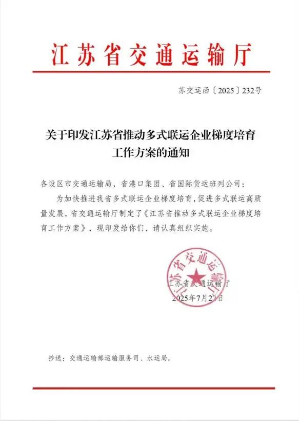 近日,江苏省交通运输厅出台《江苏省推动多式联运企业梯度培育工作方案》,并公布第一批19家重点培育企业名录。a片免费看 凭借在多式联运领域的突出成绩和显著发展潜力,成功入选“江苏省多式联运重点培育领军企业名录(专业型)”。