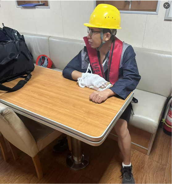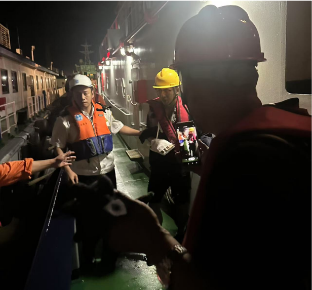 第一时间,“黄海拖06”轮全体船员迅速就位,整装待发。当晚正值台风,恶劣天气令视线模糊、航行艰难。但船长沉稳果敢,凭借丰富的经验与娴熟的技术,依托先进设备和精准导航,克服了海上复杂的气象条件和航行风险,谨慎把控航向与速度,驾驭拖轮冲破风浪,直扑航行于滨海港区附近的“海鑫成”轮。航行途中,船员们分工明确、协同作战,密切监控海况与船舶动态,及时调整策略保障航行安全,以高度的专业素养和使命感,于波涛汹涌间开辟出一条安全通道,成功将受伤船员转移到拖轮上。
