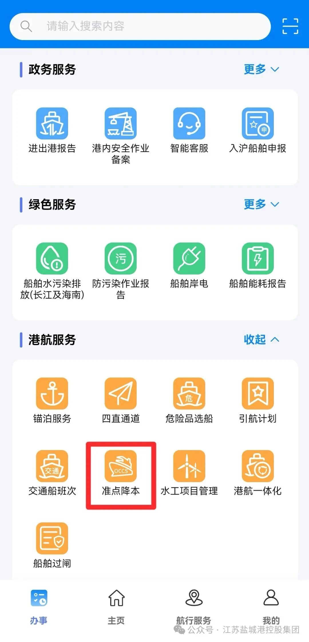第二步:登陆该法人账号后,在“办事”页面,从“港航服务”栏目中,点击“准点降本”模块进入。