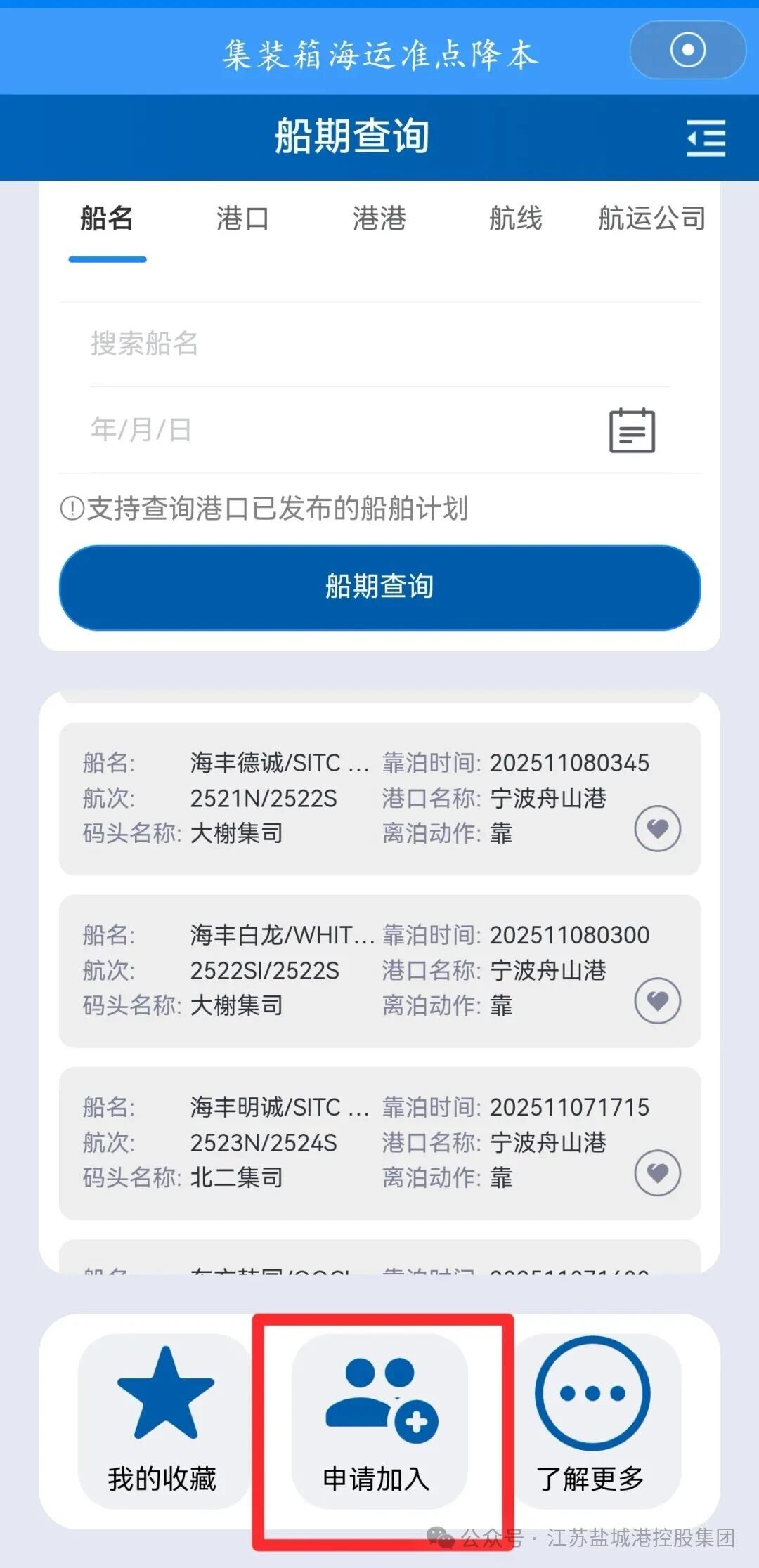 第三步:航运公司第一次登录该模块的用户,系统默认显示为船期查询页面,用户点击“申请加入”按钮,选择“我要加入”之后,输入统一社会信用代码、单位名称、联系电话、公司类型等相关信息,提交信息后,1-2个工作日之内,即可获得完整的“准点降本”模块使用权限。