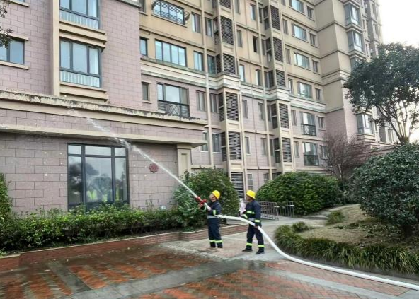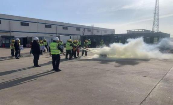 盐港物业公司则联合集团内部跨境电商、保安公司等兄弟单位,开展多场景联合演练。在莎士比亚跨境电商产业园,模拟工作人员触电场景,应急抢险小组迅速切断电源、设置警戒区,医疗救护组同步开展心肺复苏,在8分钟内完成险情处置与人员救援;在危化品运输车辆专用停放区,针对车辆故障引发的危险品起火,消防队启用干粉灭火器、消防水炮等器材,15分钟内扑灭“火情”并控制泄漏风险;在星湖花园小区,模拟居民楼电器短路起火,物业应急团队按“先控制、后消灭”原则灭火,疏散引导组逐户引导居民有序撤离,全程分工明确、响应迅速。港湾开发建设集团以典型案例为指引,组织作业现场消防灭火应急演练,演练过程指令清晰、协作有序,有效提升了施工人员应急处置能力。