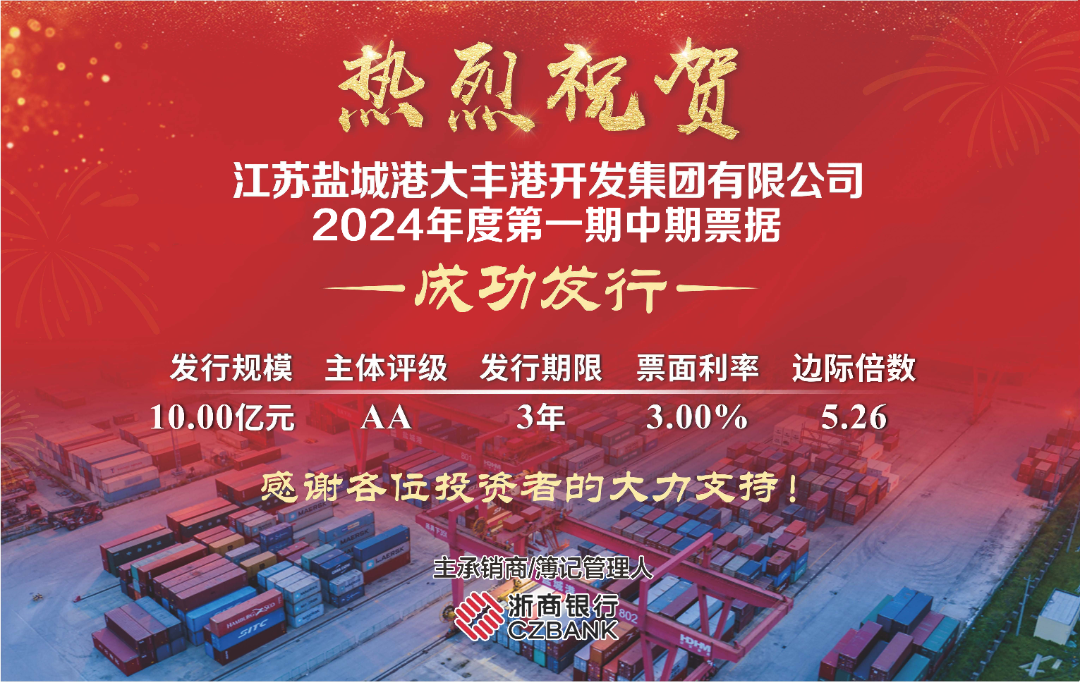 2024年4月22日,大丰港开发集团2024年度第一期中期票据成功发行,本期债券发行规模10亿元,发行期限3年,票面利率3%,边际5.26倍,创大丰港开发集团债券发行利率历史新低。