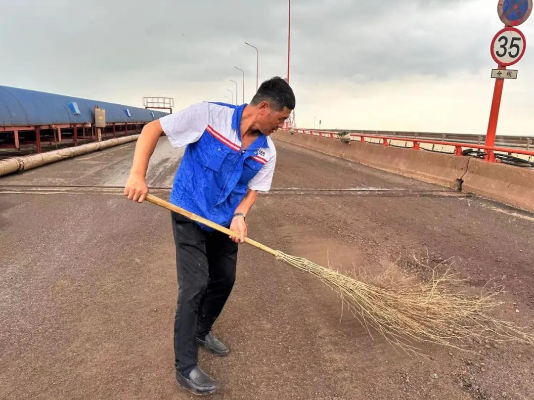 在粮食码头引桥,散落的货物残渣随处可见,清扫队员们迅速行动,认真细致地进行清理,确保做到不漏项、不脱节、无死角、无盲区。