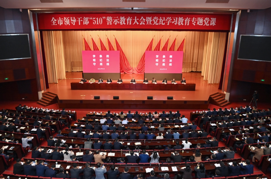 5月10日,全市领导干部“510”警示教育大会暨党纪学习教育专题党课举行,深入学习习近平总书记关于党的自我革命的重要思想,全面落实党中央和省市委关于党纪学习教育的部署要求,深化以案为鉴、以案明纪、以案促改,推动全市党员干部和公职人员认真学习《中国共产党纪律处分条例》,真正做到学纪、知纪、明纪、守纪,为推进中国式现代化盐城新实践提供坚强纪律保障。市委书记周斌出席并讲授党纪学习教育专题党课。市委副书记、市长张明康主持,市人大常委会主任王荣、市政协主席羊维达出席。