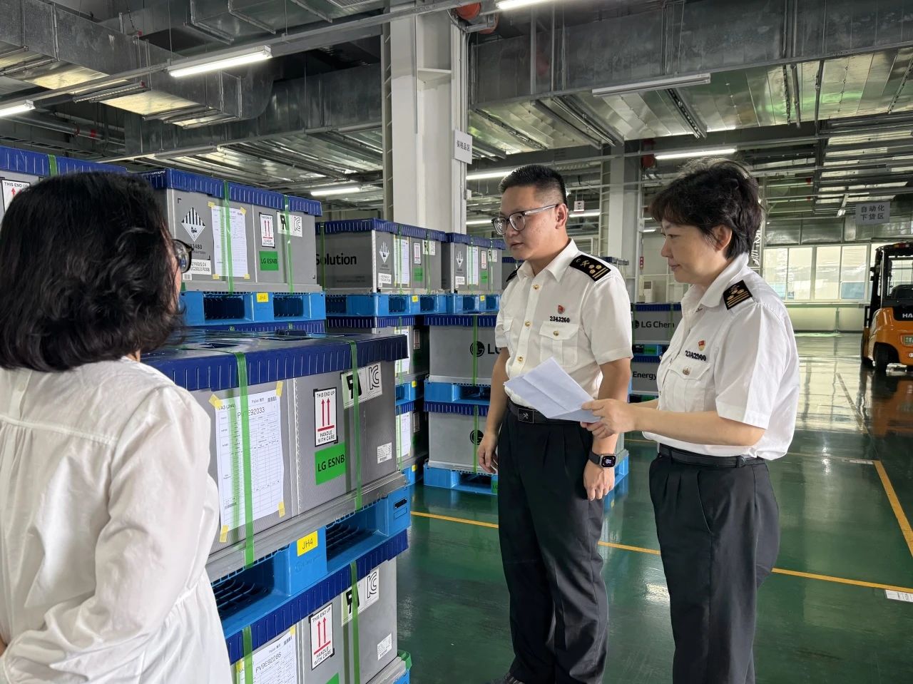 图为:金陵海关关员对出口锂电池循环包装开展现场查验。李岩/摄